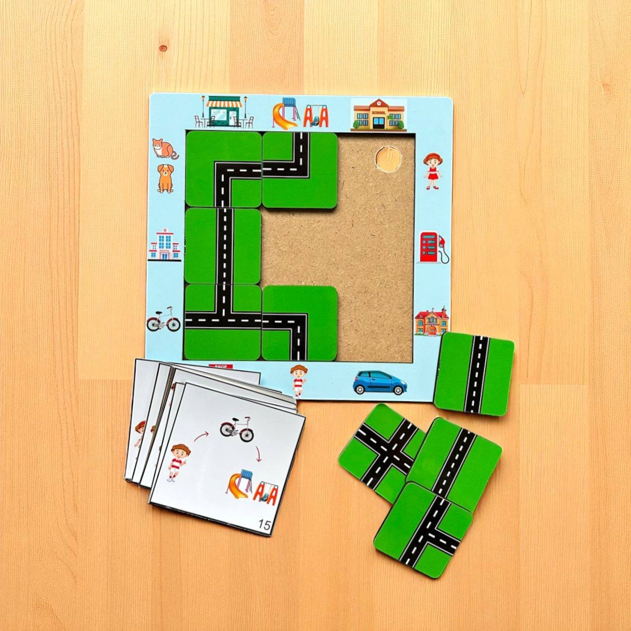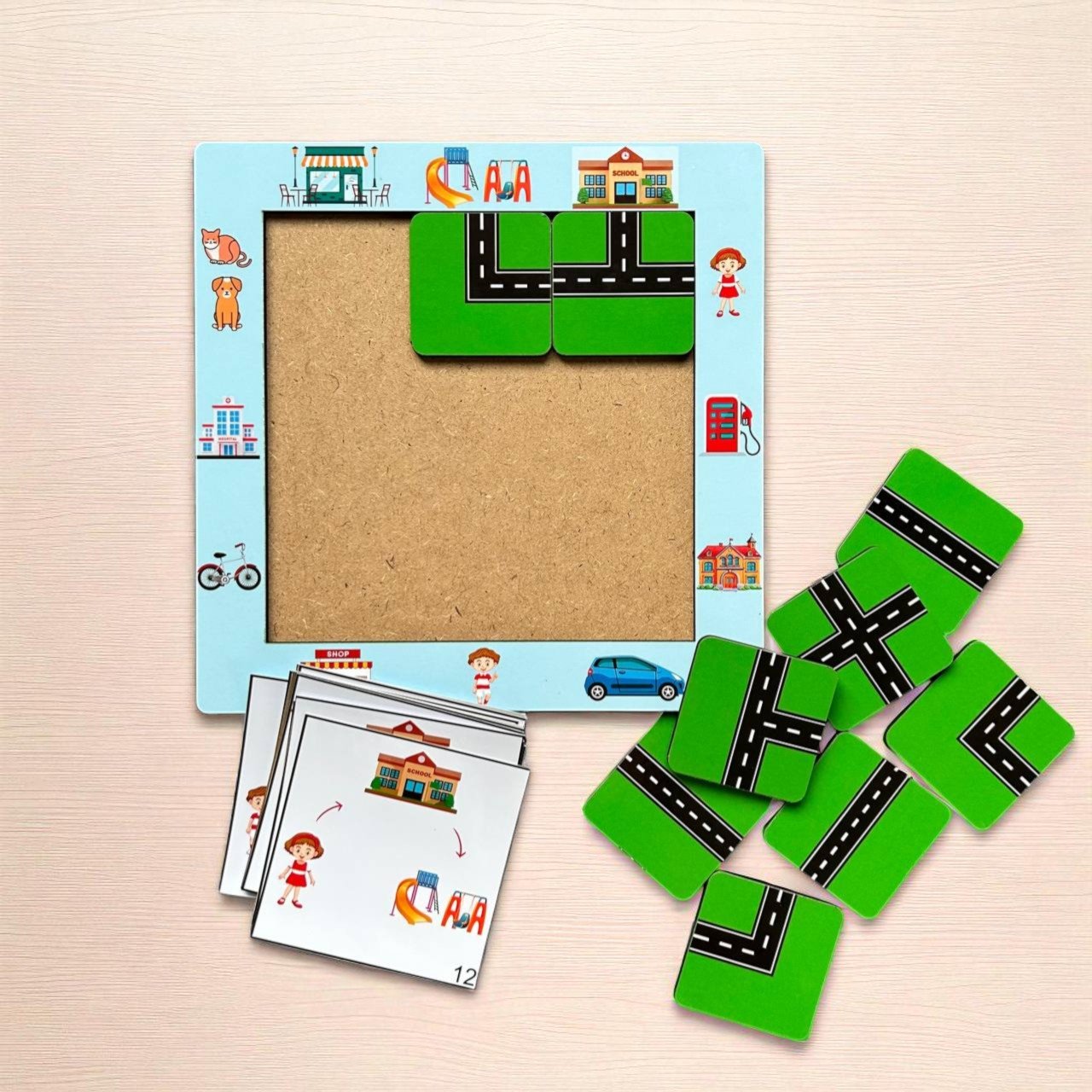 - Arrange the road tiles inside the frame to create the correct path.