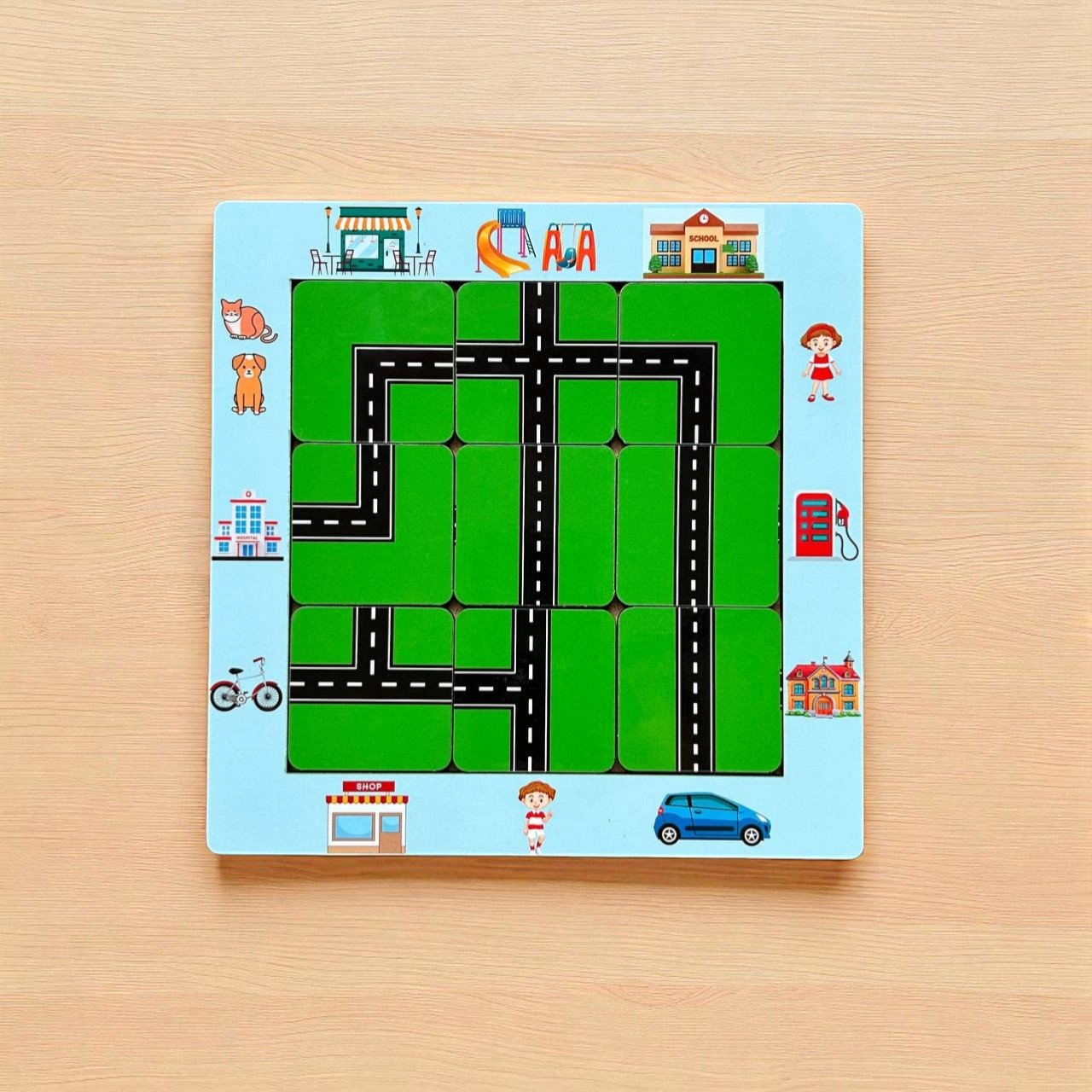 Let your little one take the wheel with the Road Map Maze – a hands-on logic puzzle where kids build real paths to connect destinations like school, playground, shop, and gas station. With every challenge card, children plan routes, think ahead, and complete the city map using road tiles.